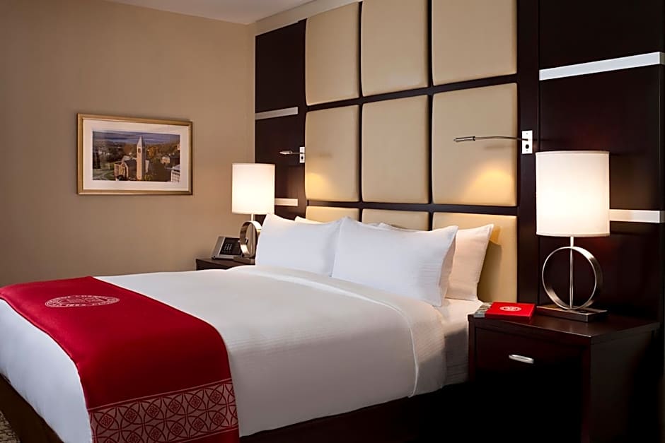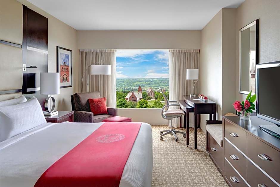 "The Tower View King is located on floors 5 – 9 and faces west with spectacular views of Cornell’s McGraw Tower and campus. The room has one king bed with room for a rollaway accommodating up to three people, plush pillow top mattress, a sitting area, a desk with an ergonomic chair, complimentary wireless high speed internet access, 43-inch LCD television, an in-room refrigerator, in-room safe, Starbucks one-cup coffee maker, and glass enclosed walk-in shower."
