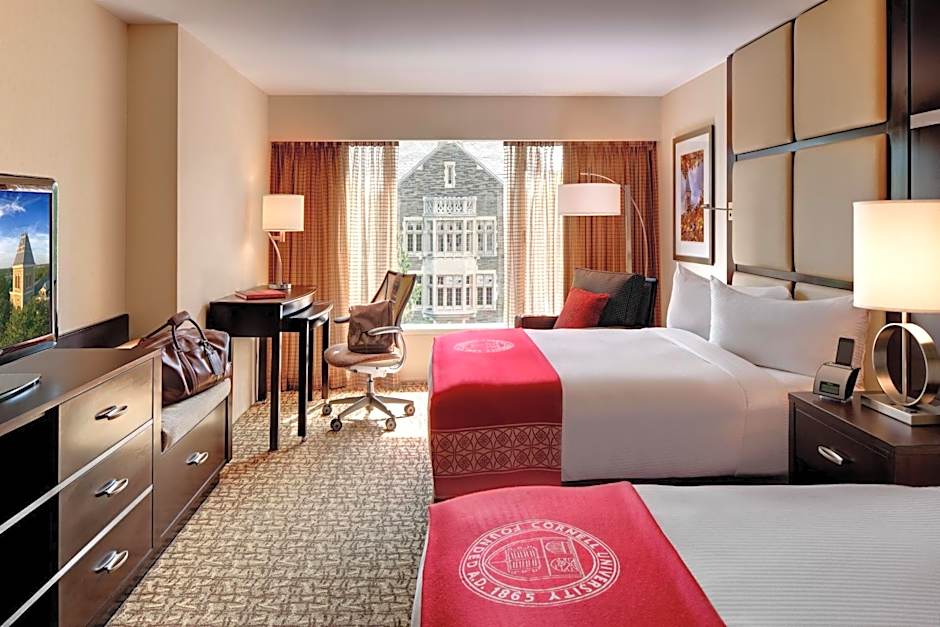 "The Tower View Two beds is located on floors 5 – 9 and faces west with a breathtaking view of Cornell’s McGraw Tower and the rolling hills of campus. The room has two full-size beds accommodating up to four people, plush pillow top mattress, a sitting area, a desk with an ergonomic chair, complimentary wireless internet access, 43-inch LCD television, an in-room refrigerator, in-room safe, Starbucks one-cup coffee maker, and glass enclosed walk-in shower. This room cannot accommodate rollaway beds or cribs."