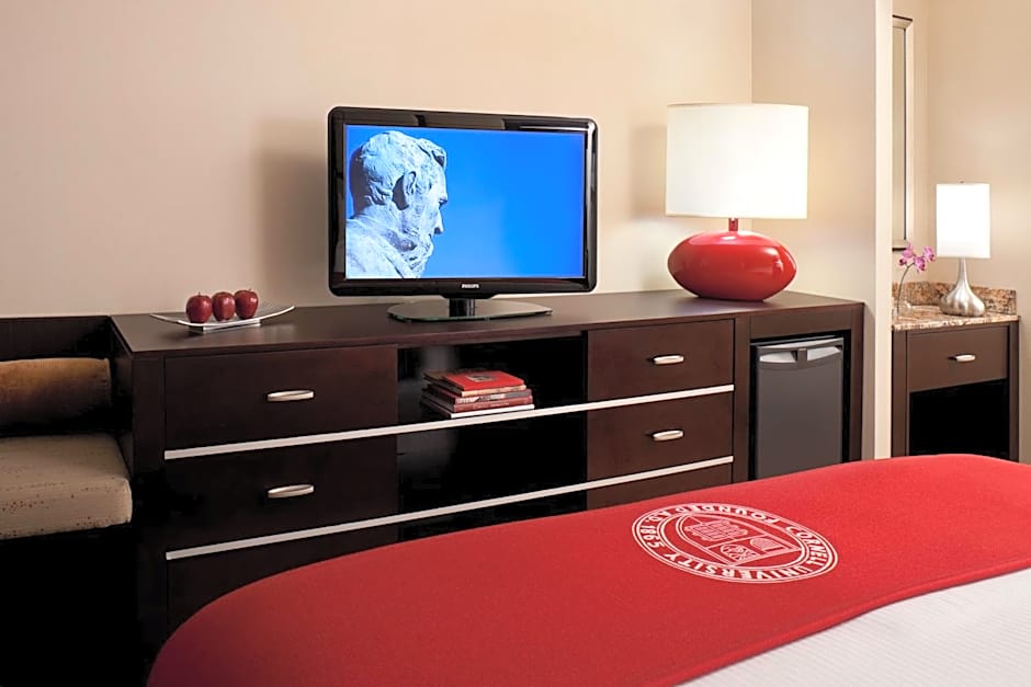 "Overlooking East campus, our Cornell Campus Suite has an architectural view of Barton and Ives Hall featuring a sitting room and bedroom separated by frosted French doors, secluding the bedroom from the sitting room. The sitting room is furnished with a couch, dining table & chairs, a desk, 43-inch LCD television, in-room refrigerator, and Starbucks one-cup coffee maker. The bedroom has a king bed, plush pillow top mattress, a 43-inch LCD television, in-room safe, and bathroom with glass-enclosed walk-in shower. This suite can accommodate three guests with the double sized sofa bed. This room cannot accommodate rollaway beds. 435 square feet"