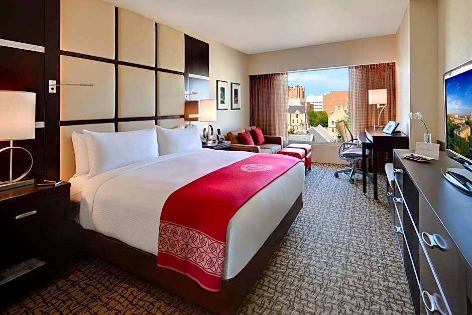 "Overlooking East campus, our traditional king has an architectural view of Barton and Ives Hall. The room has one king bed and room for a rollaway accommodating up to three people, plush pillow top mattress, a sitting area, a flexible work area, walk-in shower, complimentary wireless internet access, 43-inch LCD television, in-room refrigerator, in-room safe and Starbucks one-cup coffee maker."