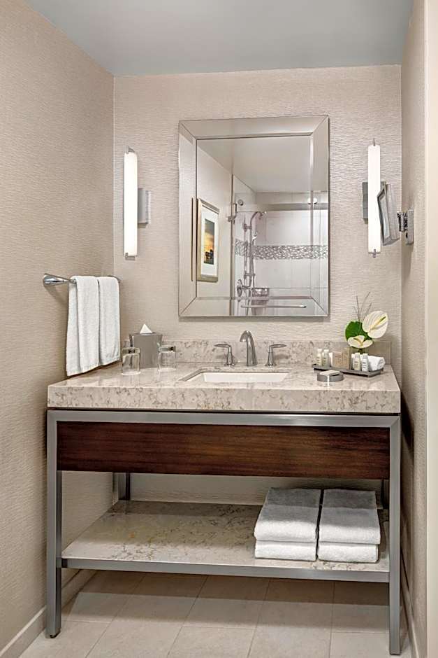 "The room has one King bed and room for a rollway accommodating up to three people, plush pillow top mattress, a flexible work area, bathtub, complimentary wireless internet access, 43-inch LCD television, in-room refrigerator, in-room safe and Starbucks one-cup coffee maker. This room is on the 3rd floor of the hotel and does not have a view."